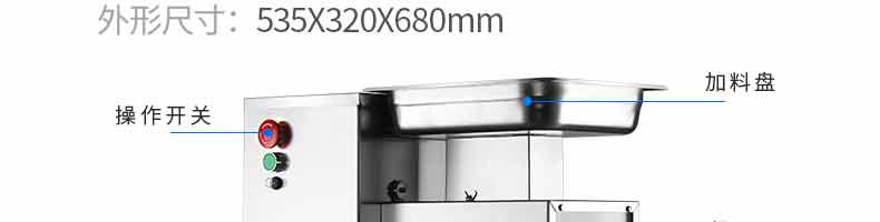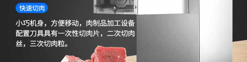 XZ-QX320-切肉機(jī),小型切肉機(jī)是一款主要對(duì)肉類進(jìn)行加工的設(shè)備,配置單層刀具一次性切肉片,二次切肉絲,再切成料。刀具采取外置懸臂式設(shè)計(jì),拆洗方便,衛(wèi)生更有保障;配置多種刀具,可加工不同厚度的肉片,實(shí)現(xiàn)一機(jī)多用;機(jī)內(nèi)裝有安全保護(hù)開(kāi)頭,刀具外露時(shí),機(jī)器自鎖不能啟動(dòng),以保安全;卸下的刀具,不用清洗直接放置在6攝氏度以下的冰箱里,刀具余肉不發(fā)臭。刀片用特殊不銹鋼材料制造,經(jīng)久耐用。