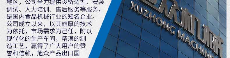 廣州旭眾食品機(jī)械有限公司是一家集科研開發(fā),生產(chǎn)設(shè)計,營銷服務(wù)為一體的現(xiàn)代化生產(chǎn)企業(yè)?,F(xiàn)代化生產(chǎn)車間,精湛制造技術(shù),所產(chǎn)機(jī)械歷經(jīng)市場重重考驗(yàn),不斷贏得海內(nèi)外客戶的贊譽(yù)。