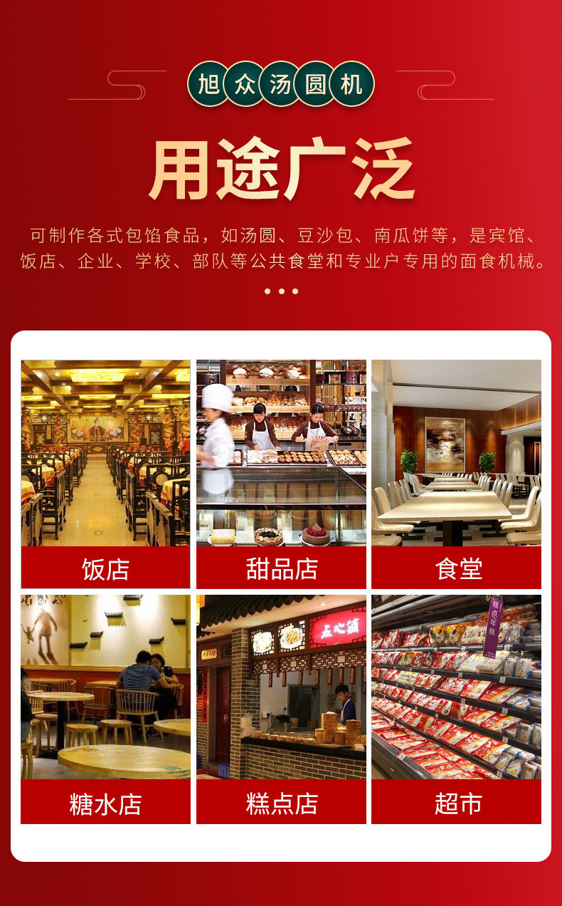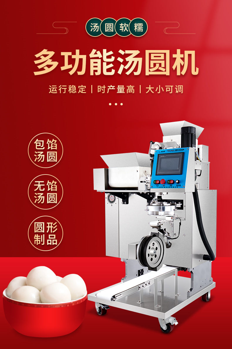 4000C湯圓機,多功能湯圓機,運行穩(wěn)定、時產量高、大小可調。制品多樣性生產各種大小規(guī)格不同的有餡湯圓,無餡湯圓、豆沙包、南瓜餅,芝麻球,地瓜丸,香芋丸,葉兒粑,青團,粘豆包等。