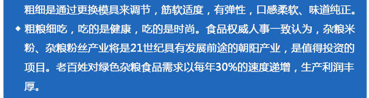 SZ-30不銹鋼米粉機,可生產(chǎn)米粉、米線、桂林米粉、過橋米線、年糕、糍粑等產(chǎn)品。各種形狀都可生產(chǎn)(圓、扁),加工食品外表光滑,厚薄、寬窄、粗細均勻可調(diào),筋軟適度,有彈性,口感柔軟、味道純正。