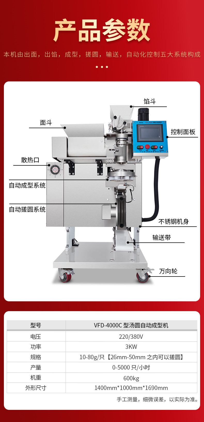 4000C湯圓機,多功能湯圓機,運行穩(wěn)定、時產量高、大小可調。制品多樣性生產各種大小規(guī)格不同的有餡湯圓,無餡湯圓、豆沙包、南瓜餅,芝麻球,地瓜丸,香芋丸,葉兒粑,青團,粘豆包等。